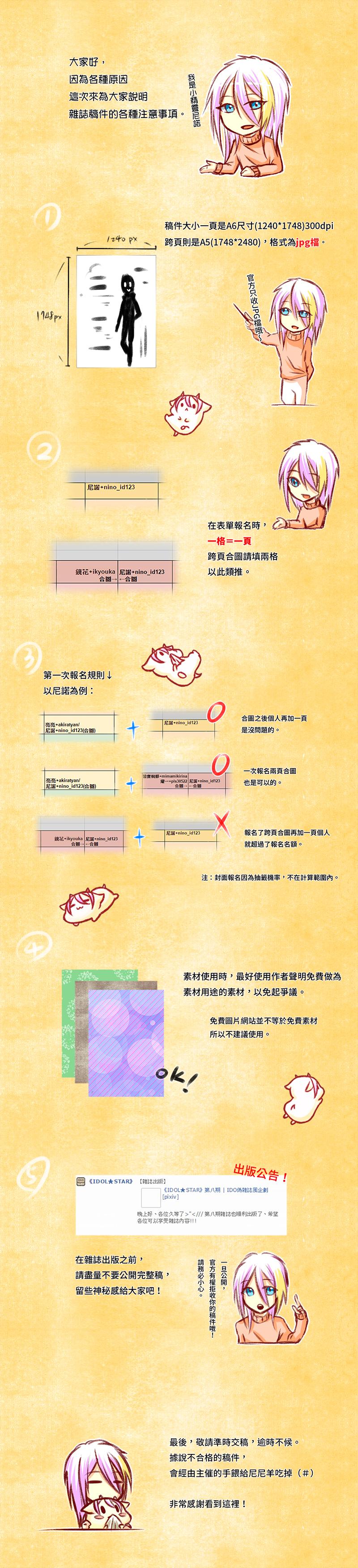 另外,雜誌從第二期開始除了在PIXIV發佈,也會發佈電子書版本,所以大家在投稿時,特別是報名跨頁的各位要注意盡量不要把字和臉等放在兩頁中間。(如果想把idol的臉從中間切開則另計)