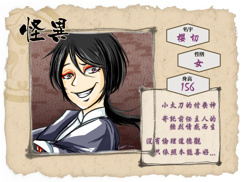前主人是個有點心理變態的連續殺人狂,在被緝捕的過程在河邊遺失了愛用兇刀之一的小太刀,過了百餘年,倚著這強烈情緒的小太刀化記得切割的快感跟血的渴望,卻以沒有人使用他,於是幻化為人形,但沒有太多的記憶,也不知道自己是何物,只知道自己是妖怪。