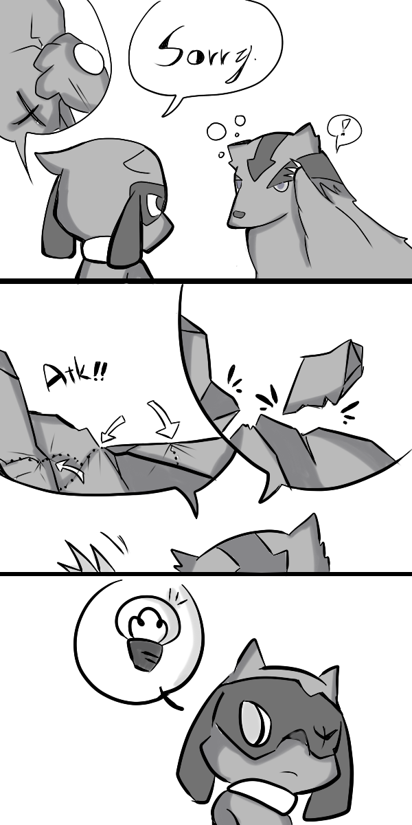 正要喊出下一個招式名,背脊突然升起一陣寒意,尾巴和渾身的短毛也反射性地豎起。暫時停下了動作,小心翼翼的轉過身查看寒意的源頭,同行的利歐路海瑟正以帶殺意的目光瞪著自己。