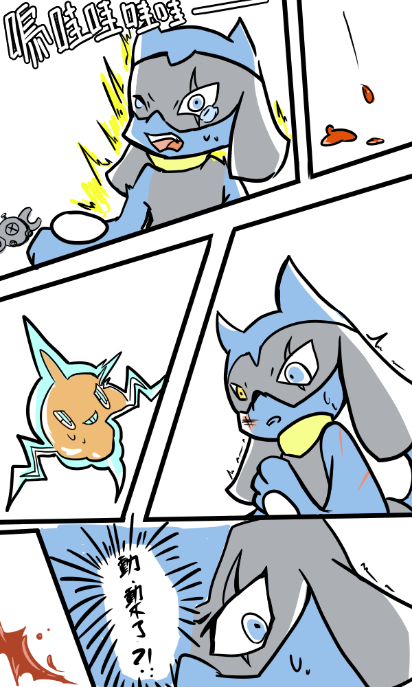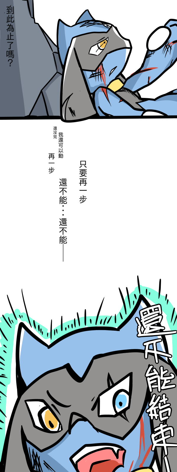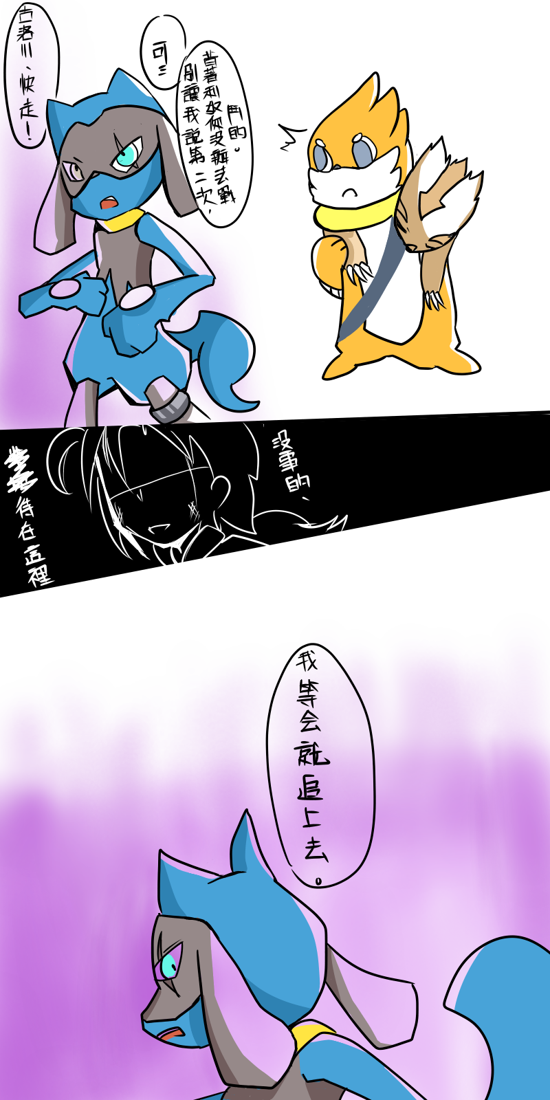 「你休息吧,再來的戰鬥交給我就好。」挺起胸膛,仰頭看著比自己高了半公尺的路卡利歐。