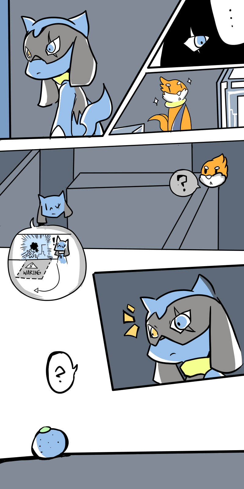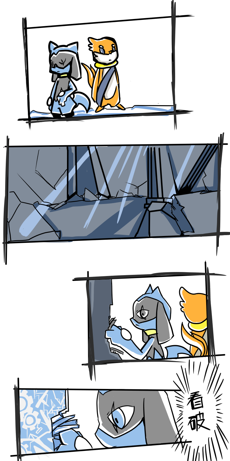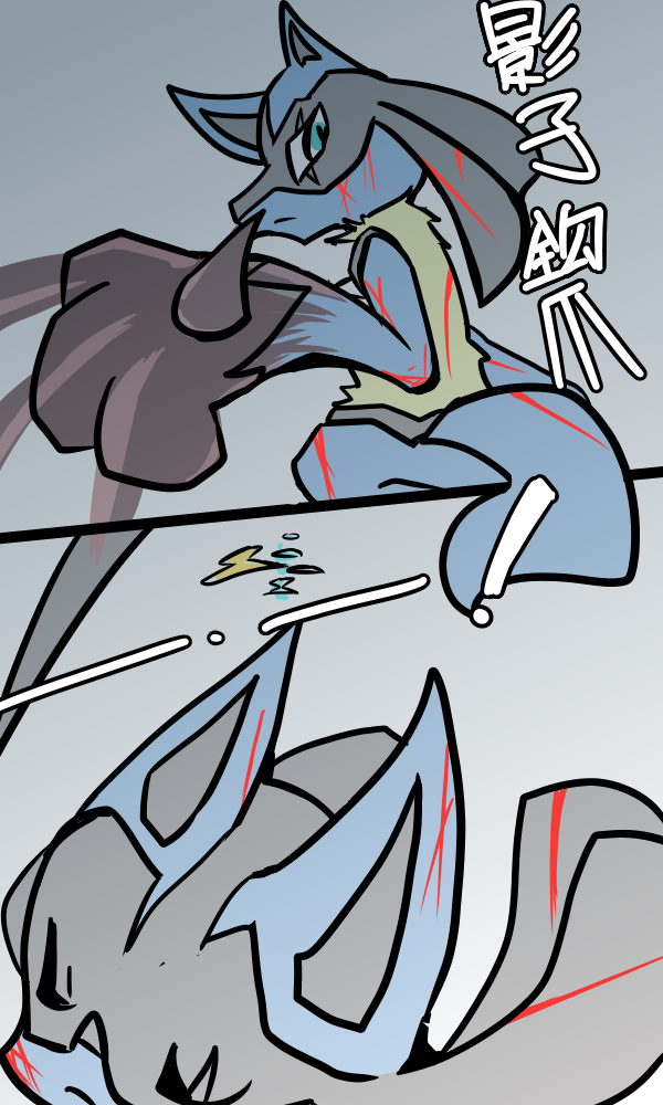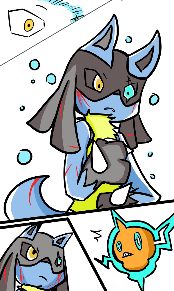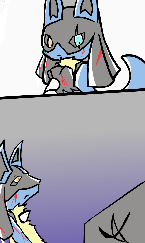 環顧石室,沒看到利歐路的身影,而是一隻路卡利歐倚著牆、半瞇著眼像在休息,身上佈滿大大小小的鮮紅傷痕,感覺到動靜,路卡利歐抬頭望向這邊,左眼上的傷和那種熟悉的波導波動讓我確定了她是海瑟沒有錯。