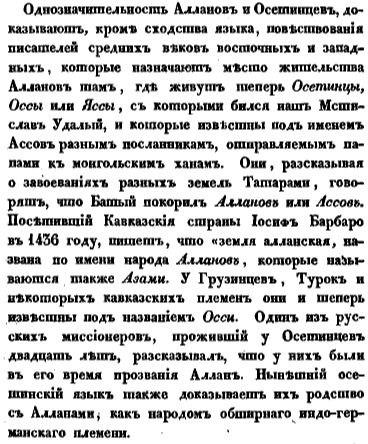 “Можно теперь считать доказанной и общепринятой истиной, что маленькая народность осетин представляет собою последних потомков большого иранского племени, которое в средние века известно было как аланы, в древние — как сарматы и понтийские скифы”.