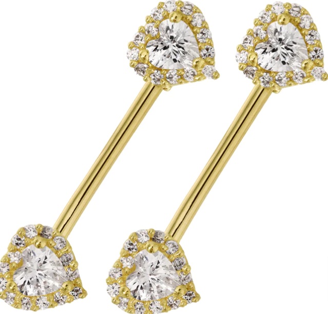 Many other types of gold nipple ring jewelry can be worn once your nipples heal, including nipple clickers (hinged clickers that look like bedazzled half-moons) and twister barbells (barbells twisted into spirals that screw on to keep them in place). Nipple shields are another popular style of nipple jewelry that looks chic and sexy, and you can even find nipple rings with gemstones for added drama.
