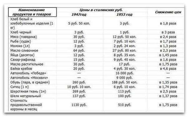 Чтобы понять большая или маленькая зарплата была у Сталина по отношению к покупательной способности населения СССР, вспомним наименование продуктов и товаров (цены были фиксированные и указаны в сталинских рублях 1947 г. / 1953 г.)