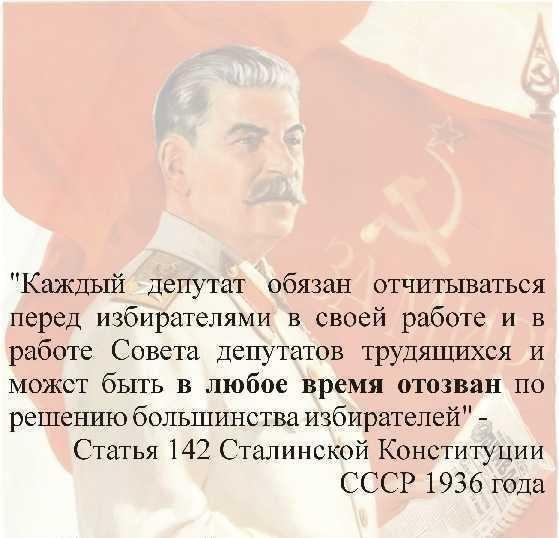 В Советском Союзе Сталиным была написана народная конституция один из пунктов которой гласил: вся власть в СССР принадлежит народу в лице народных депутатов с правом отзыва их народом в любое время...