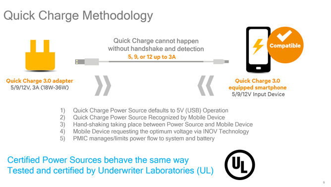 Впервые вместо ненадежного аналогового метода определения зарядного устройства был использован метод цифровой коммуникации (ведь обидно было бы сжечь контроллер заряда случайно попавшим на него напряжением в 12 В). В целом использование комбинации из планшета/телефона с QC 2.0 и соответствующего зарядного устройства давало неплохую гарантию, что зарядка пойдет именно по быстрому протоколу.