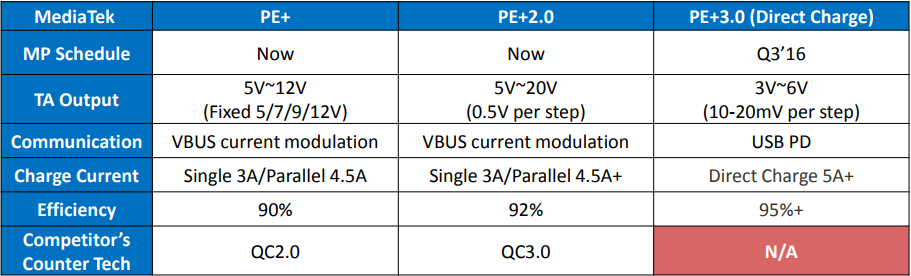 Кстати, а что тут будет с обратной совместимостью с ранними версиями PE+? Согласно официальному FAQ — совсем ничего; пожалуй, это даже неплохо — пусть наконец несовместимые стандарты вымрут. Впрочем, надежды на это мало: MediaTek заявляет, что стандарты PE+ 2.0 и 3.0 будут существовать параллельно и устанавливаться в устройства по требованию OEM.