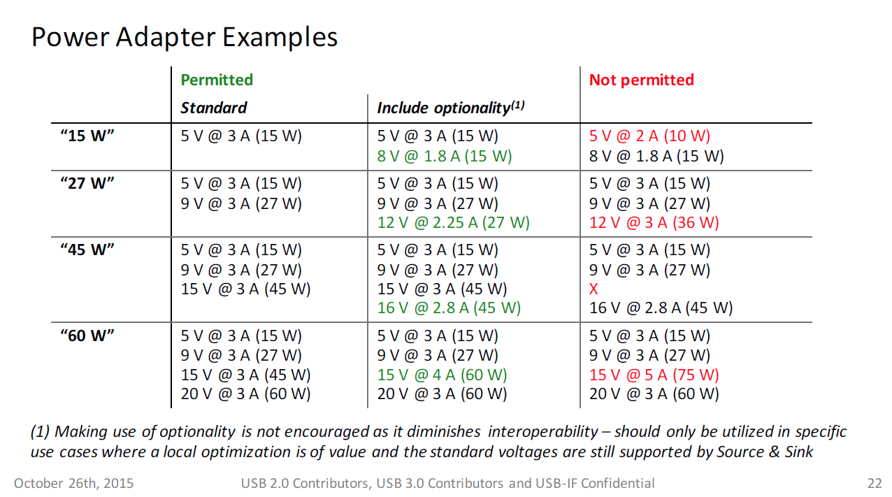 Спецификация USB Type-C 1.2, допускает передачу тока до 3 А при неизменном напряжении 5 В. В первом поколении смартфонов (Microsoft Lumia 950, 950XL, Google Nexus 5X, 6P), да и в большинстве современных, за редкими исключениями, используется именно эта спецификация, а не новый (более сложный, но обратно совместимый) стандарт USB Power Delivery.