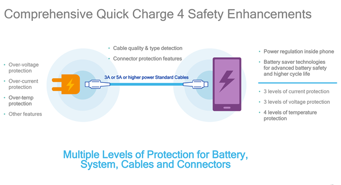 Кроме того, QC 4.0 наконец получил возможность определять качество кабеля (считыванием пассивного маркера идентификации по стандарту USB PD) и подавать более высокий ток при пониженном напряжении при использовании кабелей, соответствующих стандартам Power Delivery. Впрочем, этот момент — заслуга стандарта USB PD, а не компании Qualcomm.