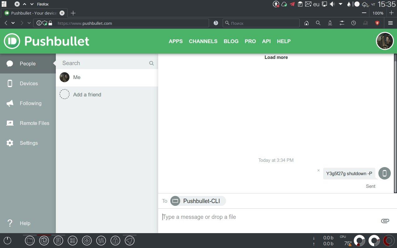 Но гораздо интереснее использовать Pushbullet в противоположном направлении, отправляя со смартфона на компьютер пуш-сообщения c командами на исполнение (например, Y3g5f27g shutdown -P):