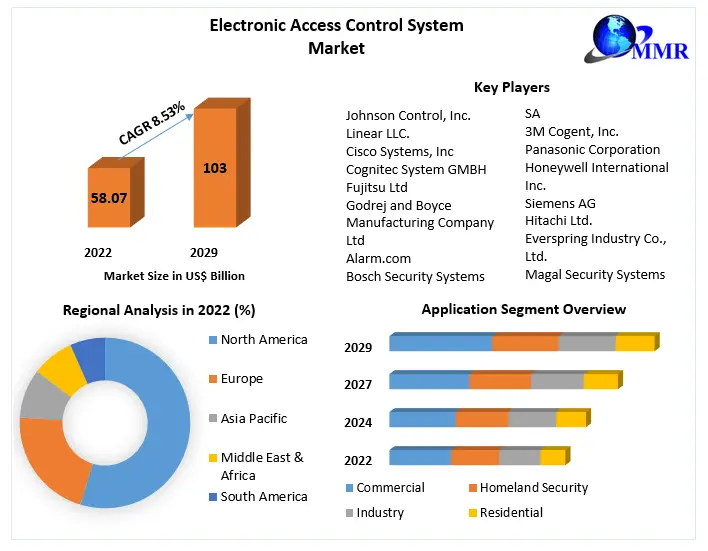 Electronic Access Control System Market is expected to grow at a CAGR of 8.53% during the forecast period. Global Electronic Access Control System Market is expected to reach US$ 103.92 Bn. by 2029.