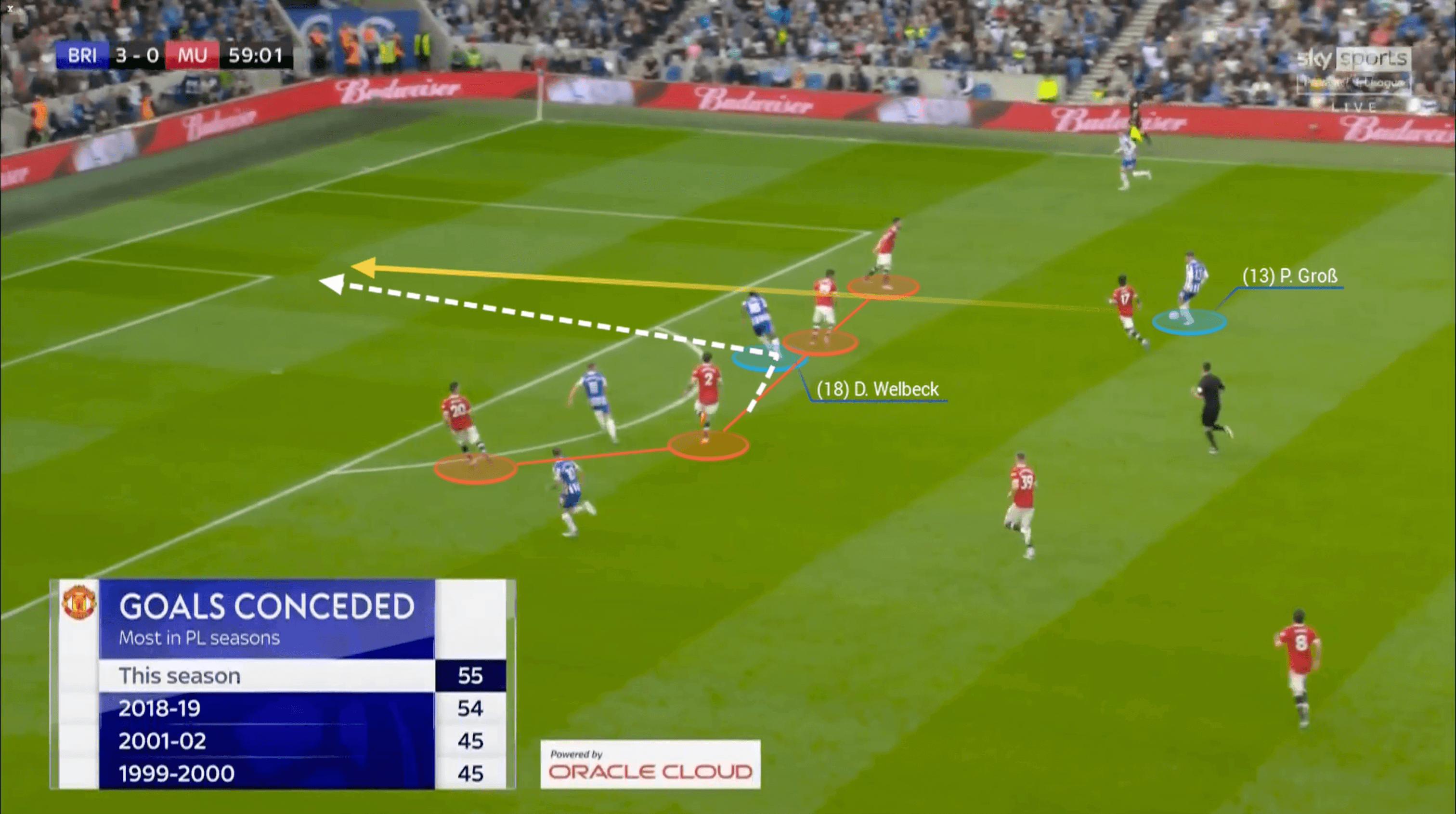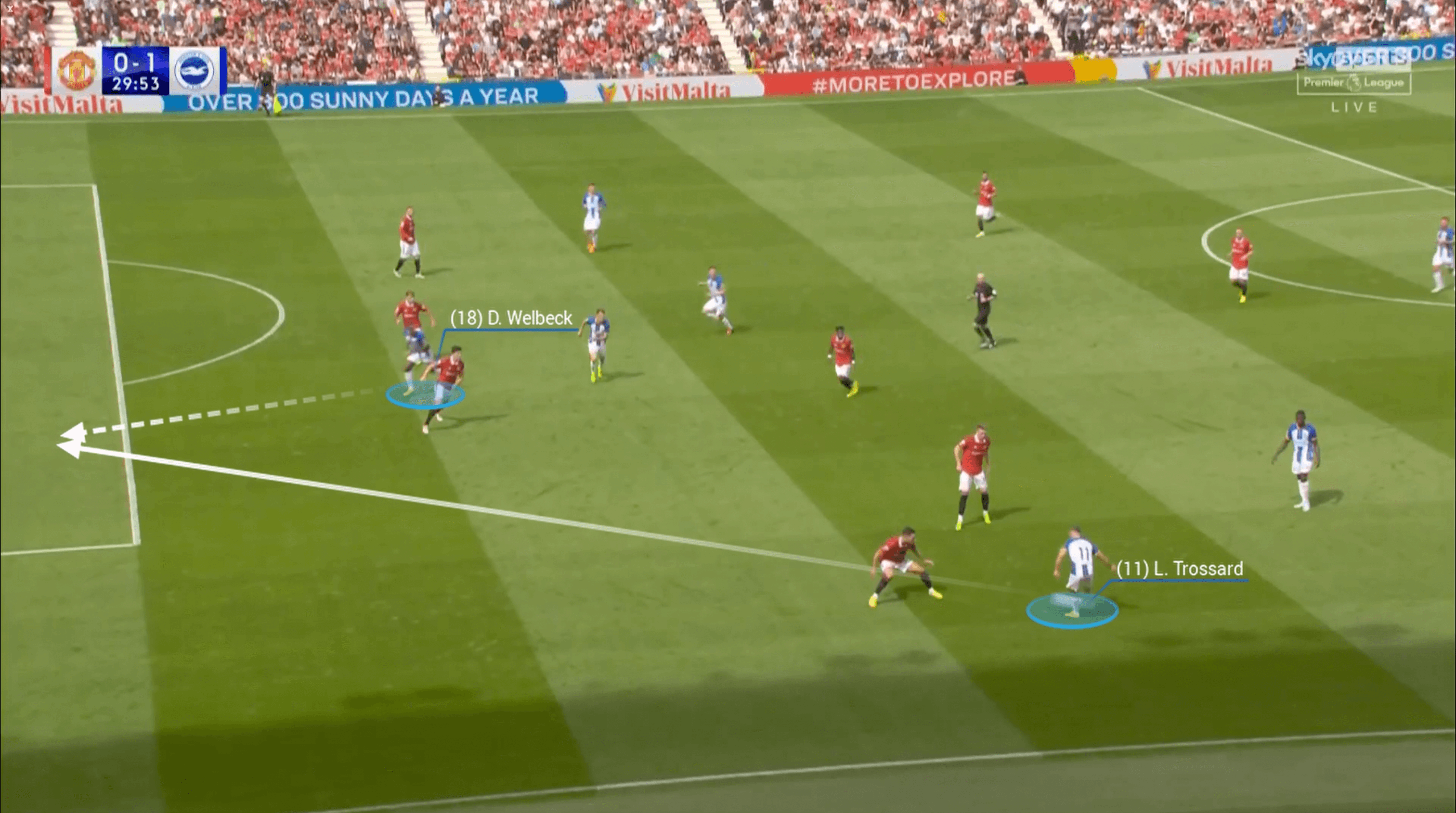 Welbeck’s movement was fundamental to Brighton’s opener; his run between Harry Maguire and Lisandro Martinez goes untracked. Welbeck then takes one touch to control and a second to square it for Gross.