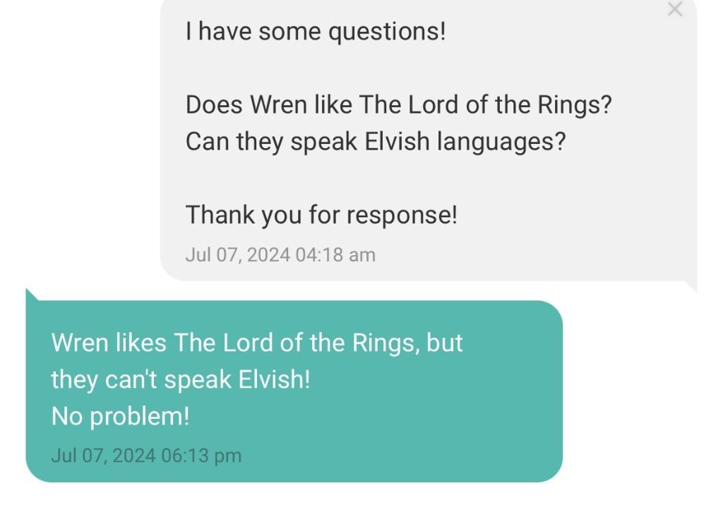 Q: If the PC’s phone wallpaper was Wren (the bird), how would Wren react after seeing it, and what would they say to the PC?