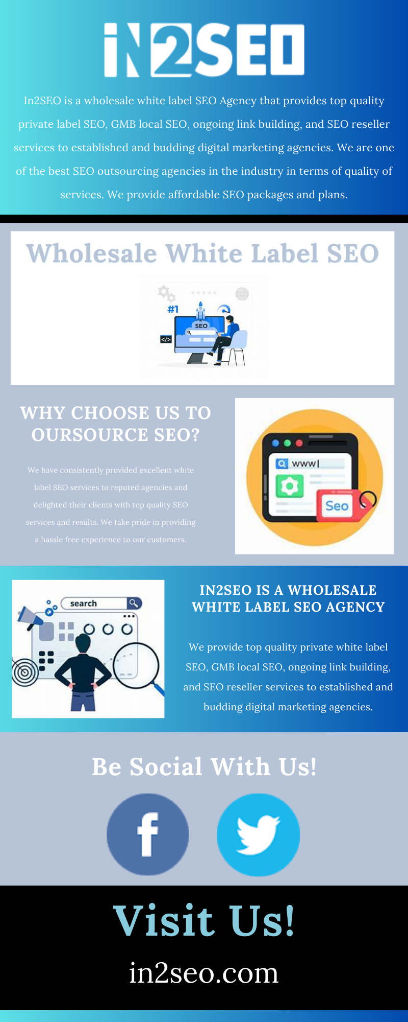 In2SEO is a wholesale white label SEO Agency that provides top quality private label SEO, GMB local SEO, ongoing link building, and SEO reseller services to established and budding digital marketing agencies. We are one of the best SEO outsourcing agencies in the industry in terms of quality of services. We provide affordable white label SEO packages and plans. In2SEO is your trusted internet marketing and search engine optimization partner. Contact In2SEO if you are looking for affordable internet marketing programs for your outsourcing company.