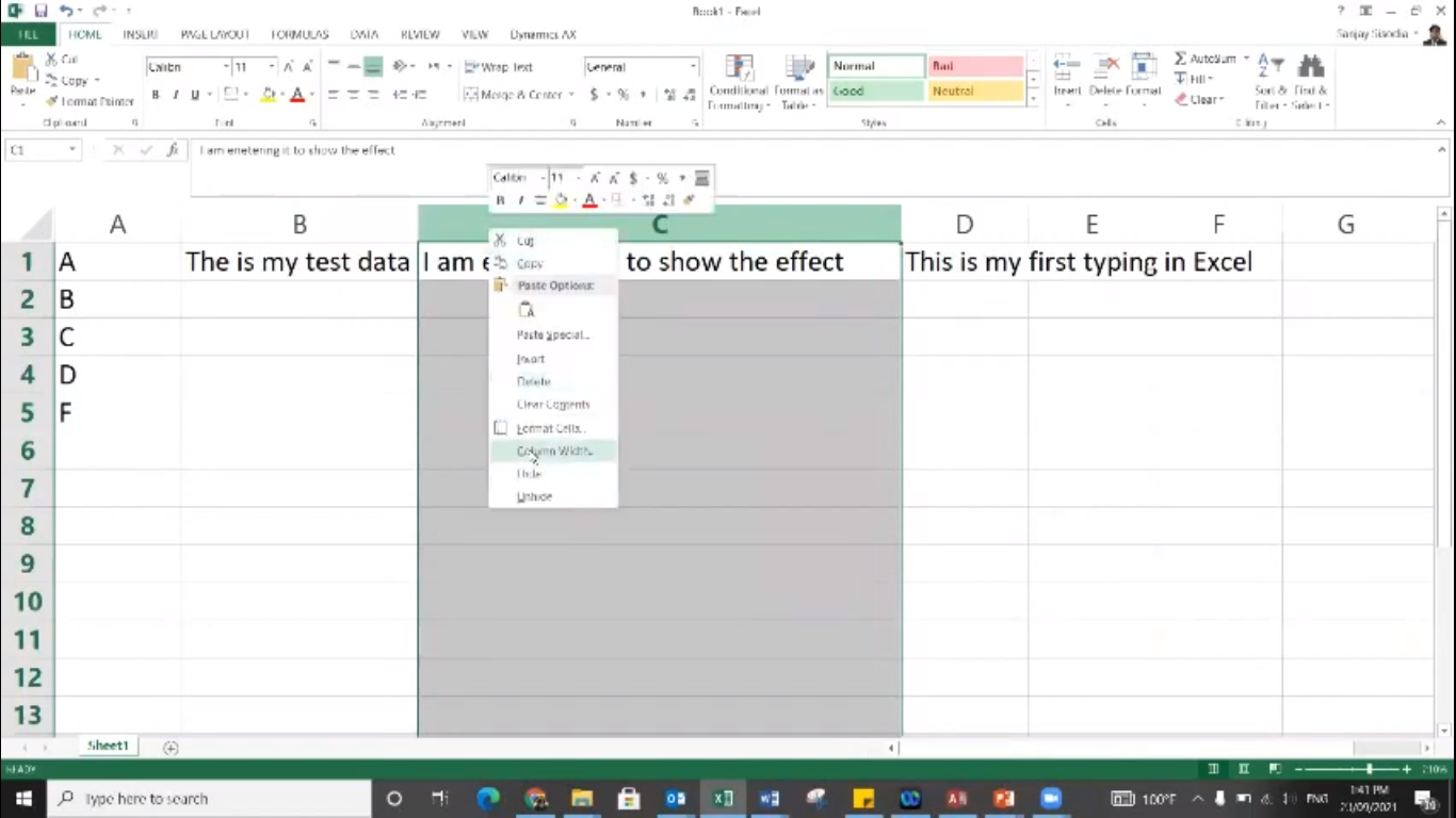 At times we require wider columns to accommodate our text and or figures. Worry not, left click on the column and when the icon appears, just drag it to the weight you want. In case you wish to have a certain uniform width for multiple columns, select the columns , right click and enter the width that you require. It’s that simple!