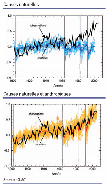 Le raisonnement suivi est illustré dans deux figures qui comparent l'évolution du climat observé depuis 1900 à des simulations issues de modèles climatiques. Dans un premier cas, celles-ci ne tiennent compte que des causes naturelles de la variabilité du climat (variations de l'activité solaire marquées par un cycle de 11 ans et de celles des volcans dont les éruptions importantes sont suivies d'un refroidissement notable qui s'estompe rapidement). Dans un second cas, elles intègrent également les modifications liées aux activités humaines, celles résultant de l'augmentation de l'effet de serre, déjà largement évoquées, et celles dues à la pollution (urbaine, industrielle ou liée aux transports), qui tend à refroidir et donc à contrecarrer, partiellement, le réchauffement lié à l'effet de serre. Les causes naturelles apparaissent incapables d'expliquer le réchauffement des dernières décennies. À l'inverse, la prise en compte de ces causes naturelles et de celles liées aux activités humaines conduit à un bon accord avec les observations. Le réchauffement récent ne peut donc s'expliquer sans tenir compte des activités humaines. À ces comparaisons s'ajoutent d'autres arguments : les seules causes naturelles conduiraient plutôt à un léger refroidissement, les variations de l'activité solaire sont de dix à vingt fois moins importantes que l'augmentation de l'effet de serre, le refroidissement observé des hautes couches de l'atmosphère est une signature du rôle prépondérant de l'effet de serre. Enfin, les données climatiques du passé récent mettent bien en exergue le caractère exceptionnel du réchauffement de la seconde partie du XXe siècle, très vraisemblablement plus chaude que n'importe quelle période de même durée depuis 500 ans, conclusion qui reste probablement correcte lorsque l'on étend le diagnostic aux 1 300 dernières années.