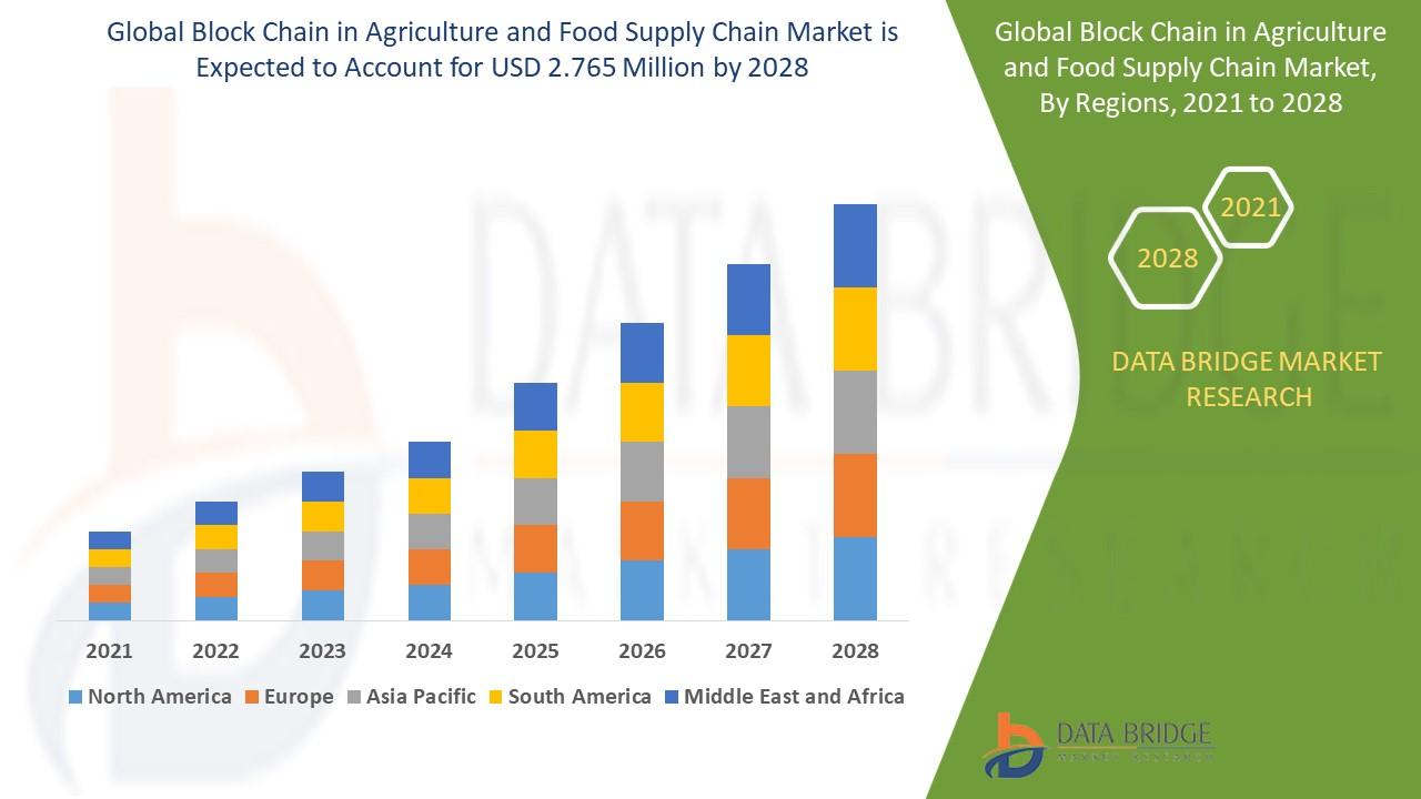 Rising food safety concerns among the consumers coupled with the rising demand for transparency in supply chain has created lucrative block chain in agriculture and food supply chain market growth opportunities. Data Bridge Market Research analyses that the global block chain in agriculture and food supply chain market will project a CAGR of 32.0% for the forecast period of 2021-2028. This highlights that fact that the current market value, that is USD 0.30 million will boom up to USD 2.765 million by the year 2028.