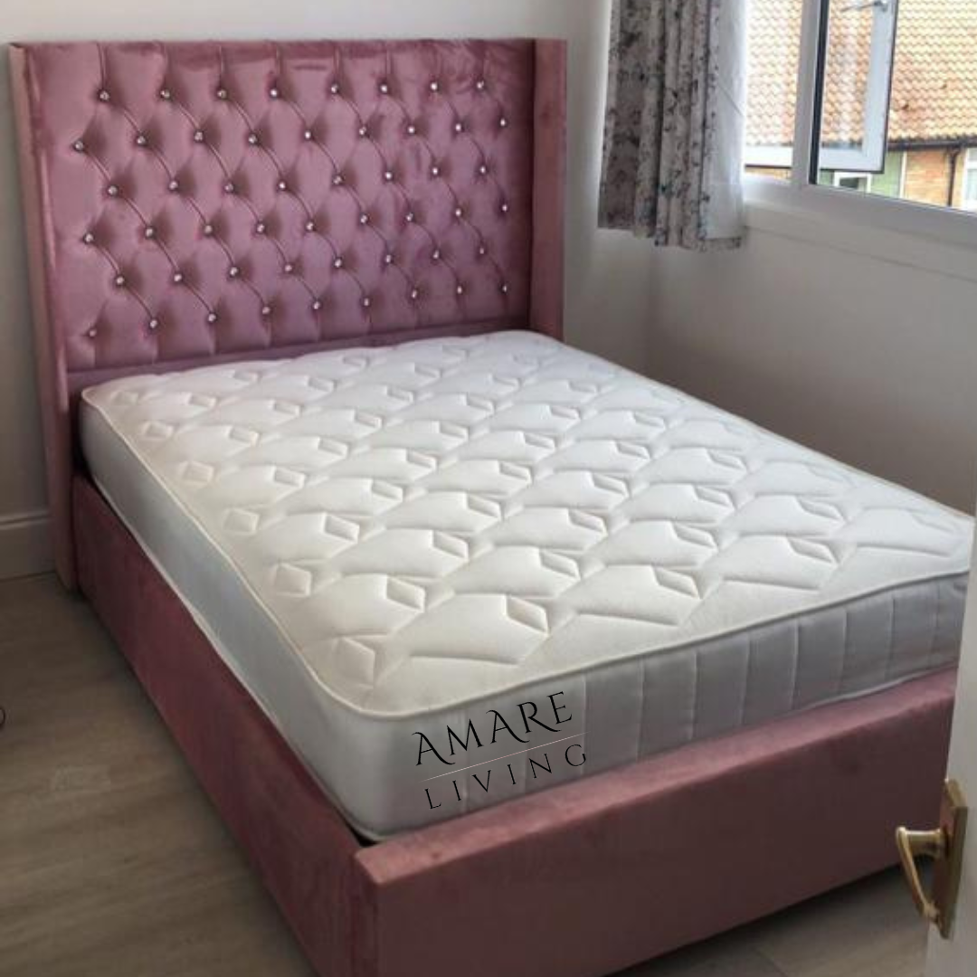 The mattress needs to be bought separately. There will be a metal gas lift frame with beech sprung slats as the ottoman storage option.