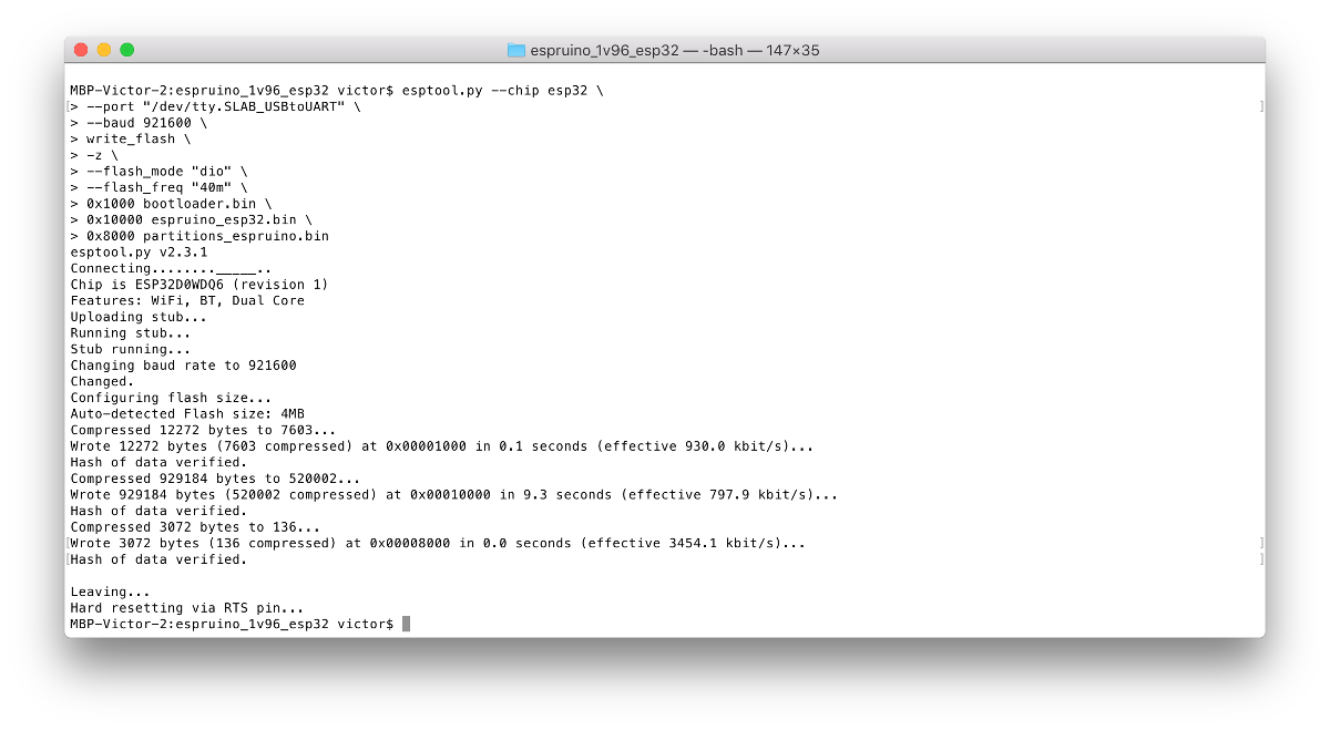 espruino_esp32.bin.esptool.py \ --chip esp32 \ --port /dev/ttyUSB0 \ --baud 921600 \ --after hard_reset write_flash \ -z \ --flash_mode dio \ --flash_freq 40m \ --flash_size detect \ 0x1000 bootloader.bin \ 0x8000 partitions_espruino.bin \ 0x10000 espruino_esp32.bin