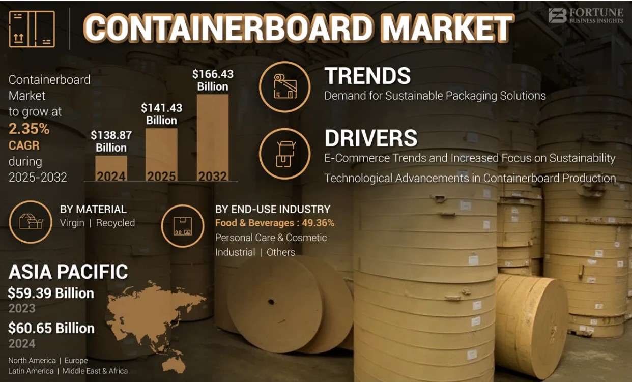 The global containerboard market size was valued at USD 132.88 billion in 2023 owing to the rising demand for sustainable packaging worldwide. Containerboards are paperboards used generally for packaging material due to their properties such as lightweight and paperweight, or high grammage. A recently published report by Fortune Business Insights™ titled, “Containerboard Market Size, Share & Industry Analysis, By Material (Virgin, and Recycled), By End-User (Food & Beverage, Personal Care & Cosmetics, Industrial, and Others), and Regional Forecast, 2025-2032,” offers a qualitative and quantitative analysis of the market. The global containerboard market size was valued at USD 138.87 billion in 2024. It is projected to be worth USD 141.43 billion in 2025 and reach USD 166.43 billion by 2032, exhibiting a CAGR of 2.35% during the forecast period.