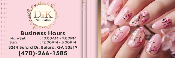Discover a personal, luxurious, and joyful nail care experience at D&K Nails Salon in Buford, GA 30519. We offer a wide variety of high-quality services, including manicures, pedicures, gel enhancements, acrylics, dipping powder, and spa treatments.