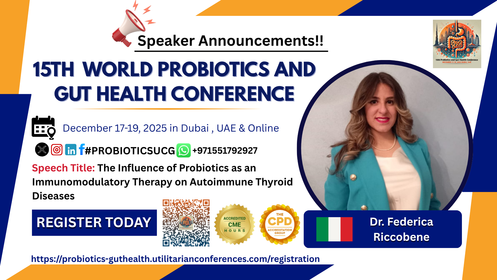 Join Dr. Federica Riccobene and other leading experts at the 15th World Probiotics and Gut Health Conference, taking place December 17–19, 2025, in Dubai and online.