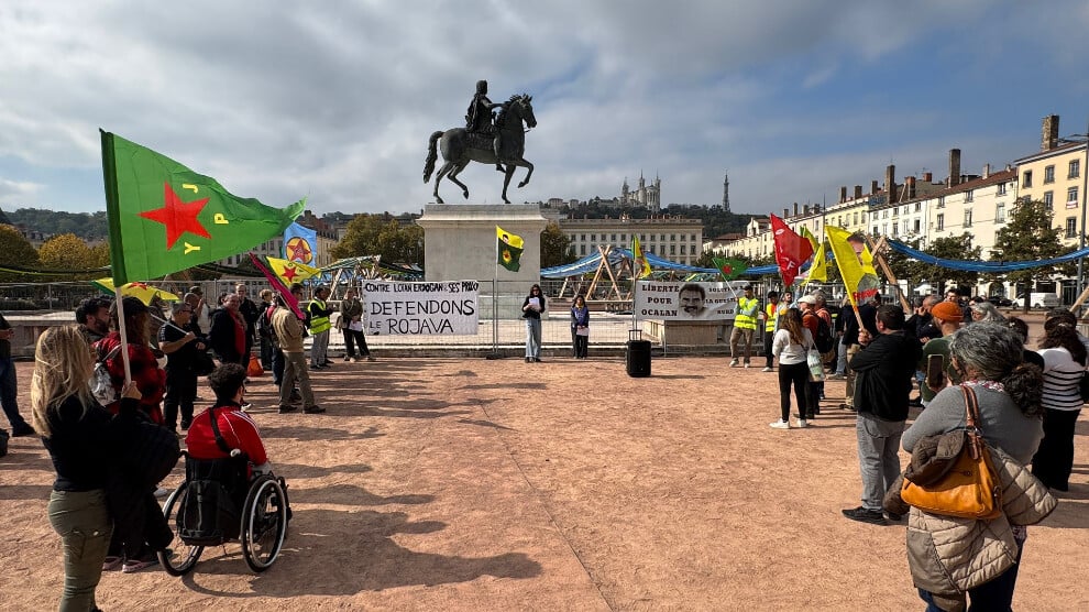 Fransa’nın Lyon kentinde Demokratik Kürt Toplum Merkezi (DKTM) organizasyonunda bir araya gelen grup, 9 Ekim komplosu ve Rojava’ya dönük saldırıları protesto etti.