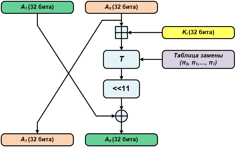 Это преобразование включает в себя сложение правой части блока с итерационным ключом по модулю 32, нелинейное биективное преобразование и сдвиг влево на одиннадцать разрядов: