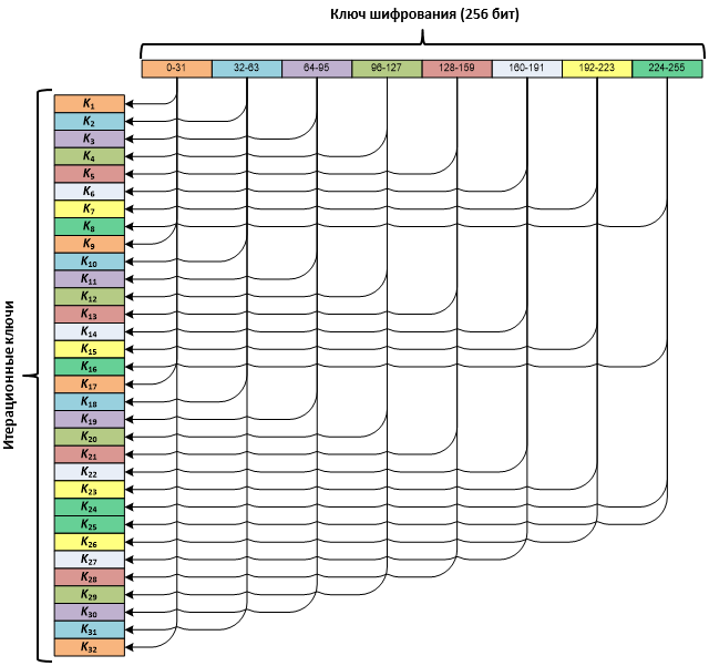 Итерационные ключи получаются из исходного 256-битного ключа. Исходный ключ делится на восемь 32-битных подключей, и далее они используются в следующем порядке: три раза с первого по восьмой и один раз с восьмого по первый.