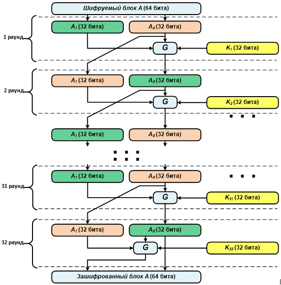 Как мы уже говорили, шифрование производится путем тридцати двух итераций, с первой по тридцать первую с применением преобразования G и тридцать вторую с применением финального преобразования G: