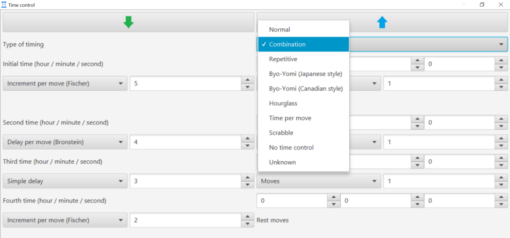 This program has all time controls in chess clocks, but if you need more complex time controls, you could use them as well, because this program allows you to start a game from any position by two different time controls. Therefore, you could handle any time control any time in any position. After finishing your game, you could import all moves into the initial game and see your game in one single game but not in multiple segments.