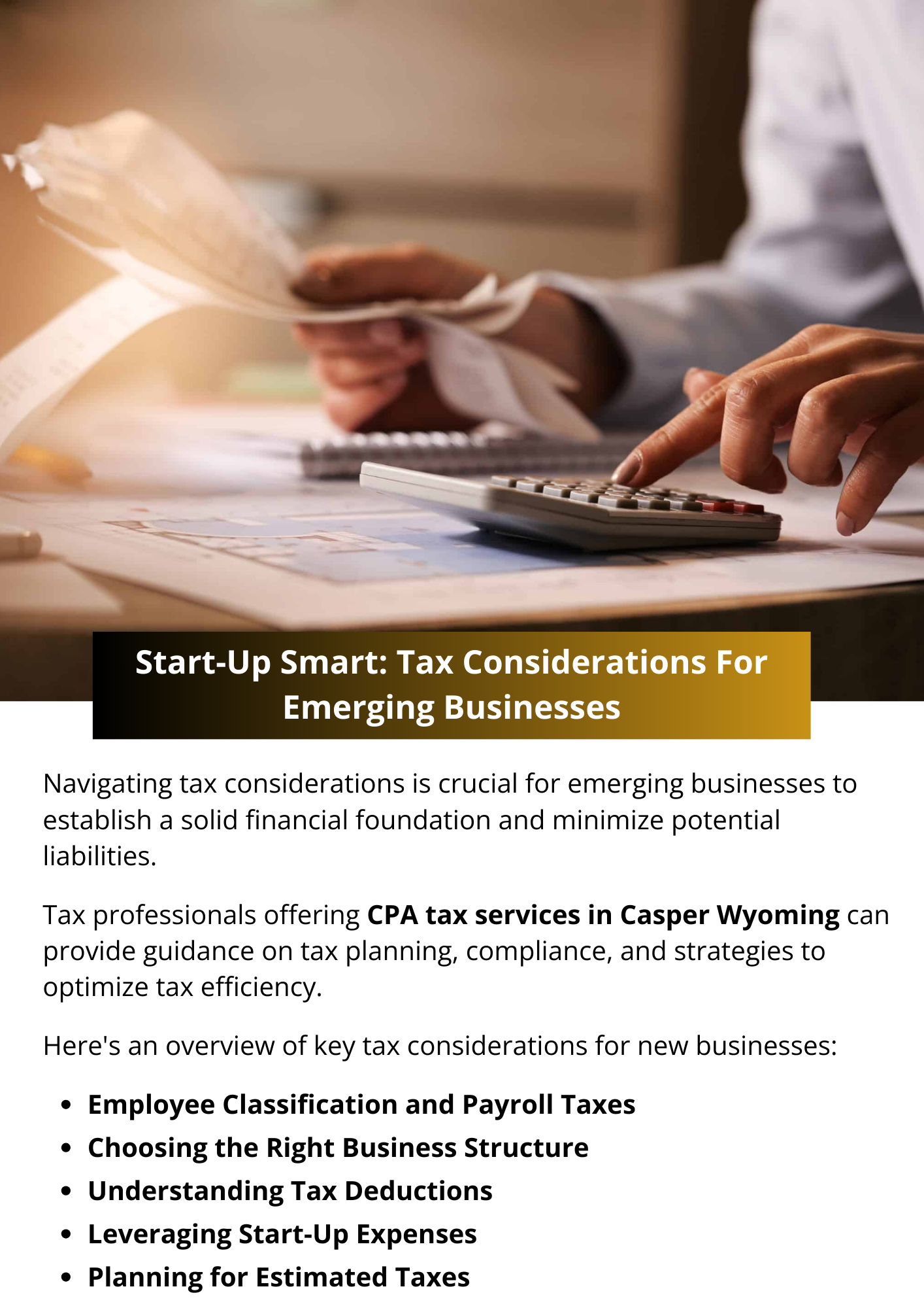 Navigating tax considerations as an emerging business requires careful planning and compliance with federal, state, and local tax laws. By choosing the right business structure, understanding deductible expenses, and staying informed about tax credits and incentives, you can establish a strong foundation for financial success. Regularly consulting with a tax professional will ensure that you're making informed decisions and maximizing tax benefits while avoiding costly mistakes. To know more visit here https://www.straighttalkcpas.com/cpa-services-casper-wyoming