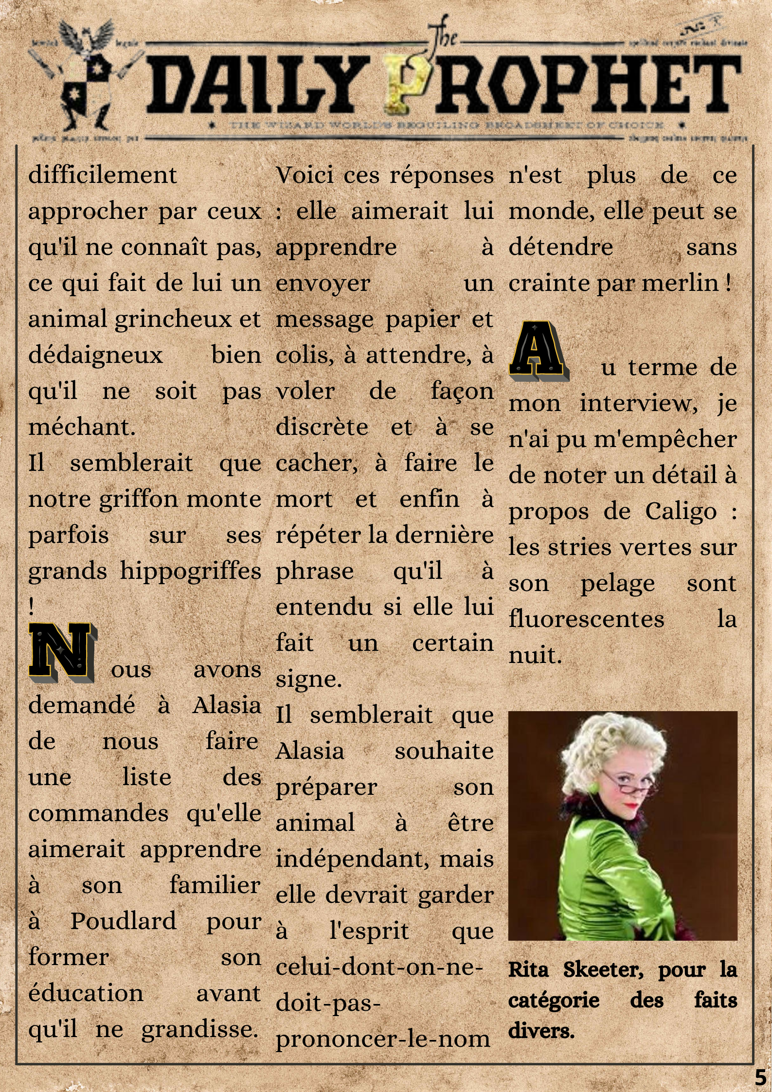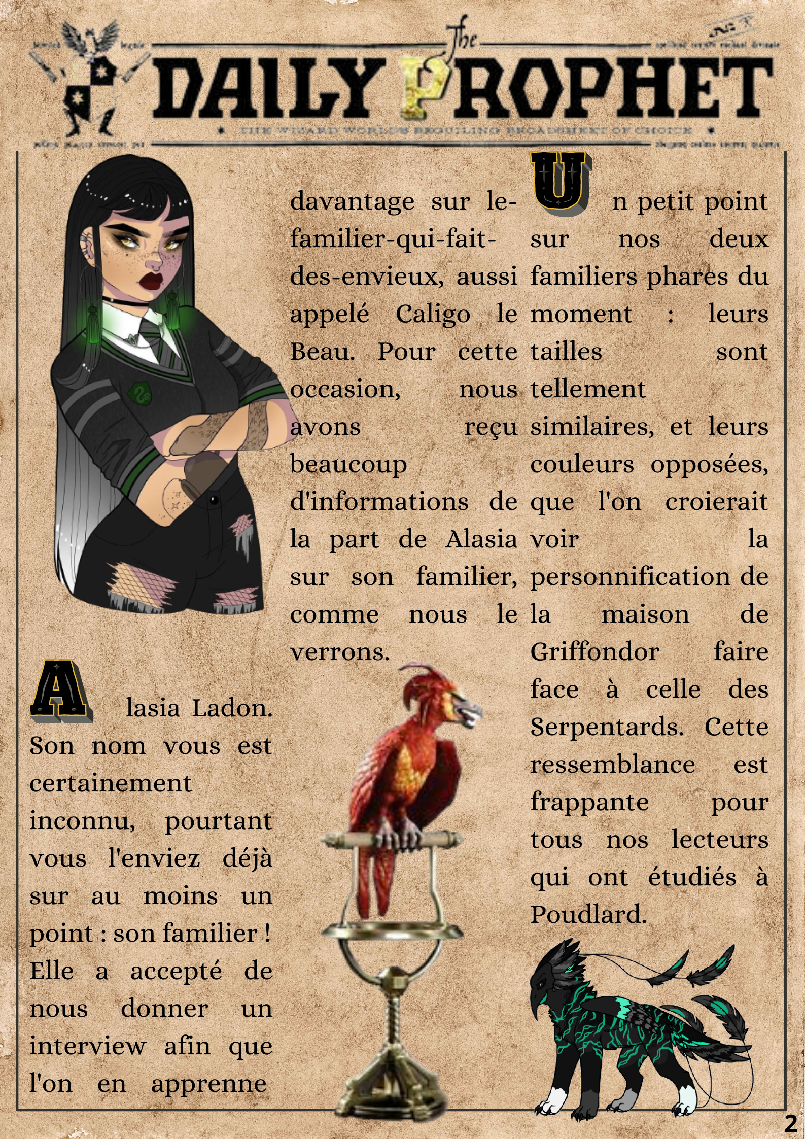 Alasia Ladon a choisi de participer à une interview pour le journal quotidien The Daily Prophet, et a joint ci-dessous l'exemplaire exclusif en avant-première de son entretien avec la journaliste Rita Skeeter, qui lui a coïncidemment posé les questions qui sont requises pour ce devoir, entre autre.