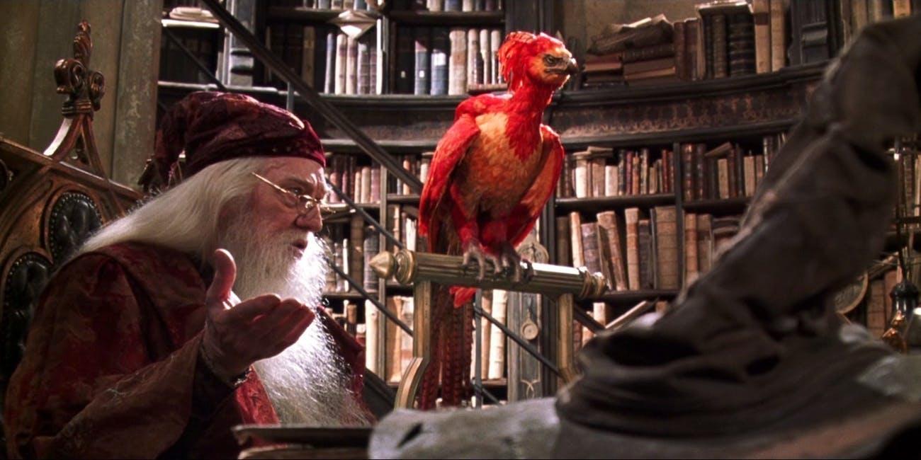 Le phœnix de feu Albus Dumbledore en contexte, afin de mieux apprécier sa taille :