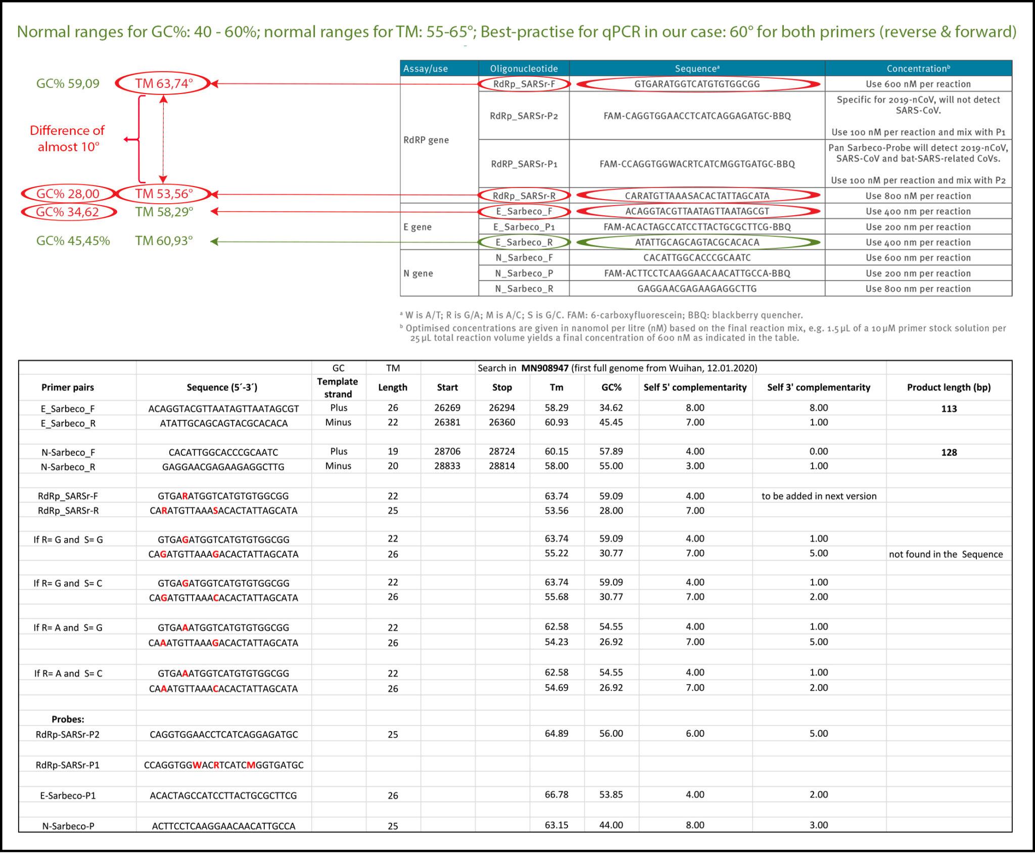 Πίνακας 3: Το περιεχόμενο GC των εκκινητών και ανιχνευτών (προσαρμοσμένο στην εργασία Corman-Drosten, επισημαίνονται οι παρεκκλίσεις από βελτιστοποιημένα περιεχόμενα GC. Το δεύτερο πλαίσιο δείχνει μια λίστα με όλες τις τιμές βέλτιστων πρακτικών Primer-BLAST για όλους τους εκκινητές και τους ανιχνευτές που χρησιμοποιούνται στο έγγραφο Corman-Drosten του καθηγητή Dr. Ulrike Kämmerer και της ομάδας της