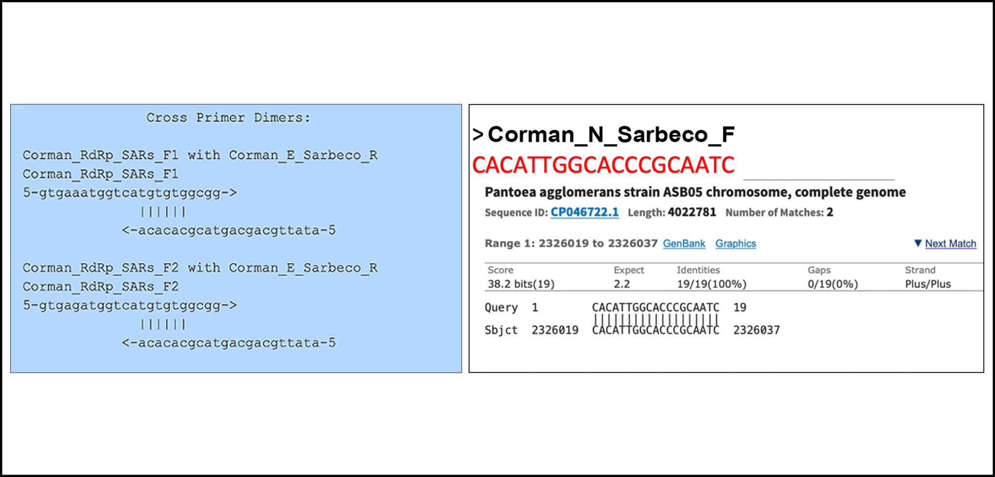 Σχήμα 3: Μια ανάλυση με το εργαλείο διμερών εκκινητών Thermofischer αποκαλύπτει ότι ο μπροστινός εκκινητής RdRp έχει ομολογία 6bp 3 "με το Sarbeco E Reverse (αριστερό πλαίσιο). Μια άλλη ανάλυση αποκαλύπτει ότι υπάρχει ένας τέλειος συνδυασμός για έναν από τους Ν-εκκινητές με ένα κλινικό παθογόνο (Pantoea) που βρίσκεται σε ανοσοκατασταλμένους ασθενείς (δεξί κουτί)