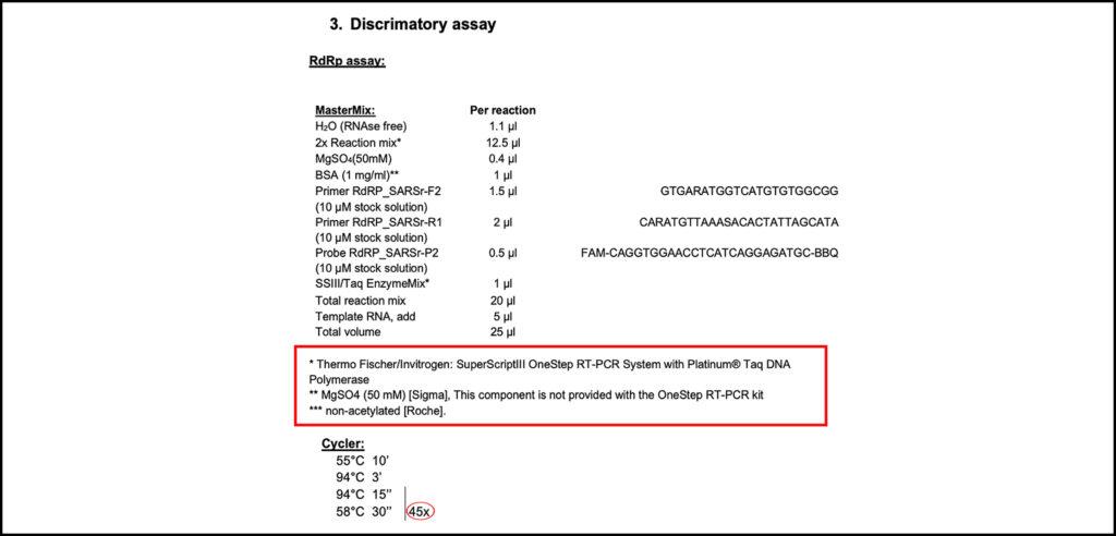 Το πρωτόκολλο του ΠΟΥ (Σχήμα 1), το οποίο βασίζεται εξ ολοκλήρου στην εργασία Corman-Drosten, καταλήγει στο συμπέρασμα ότι για να επιβεβαιωθεί η παρουσία του SARS-CoV-2, πρέπει να προσδιοριστούν δύο γονίδια ελέγχου (τα γονίδια E-και RdRp) στην ανάλυση. Θα πρέπει να σημειωθεί, ότι το RdPd-γονίδιο έχει μία αβέβαιη θέση («ακαθόριστη») στον εμπρόσθιο εκκινητή (R = G / A), δύο αβέβαιες θέσεις στον αντίστροφο εκκινητή (R = G / A, S = G / C) και έχει τρεις αβέβαιες θέσεις στον RdRp-probe (W = A / T, R = G / A, M = A / C). Έτσι, δύο διαφορετικοί εμπρόσθιοι εκκινητές, τέσσερις διαφορετικοί αντίστροφοι εκκινητές και οκτώ διαφορετικοί ανιχνευτές μπορούν να συντεθούν για το RdPd-γονίδιο. Αθροιστικά, υπάρχουν 64 πιθανοί συνδυασμοί εκκινητών και ανιχνευτών!