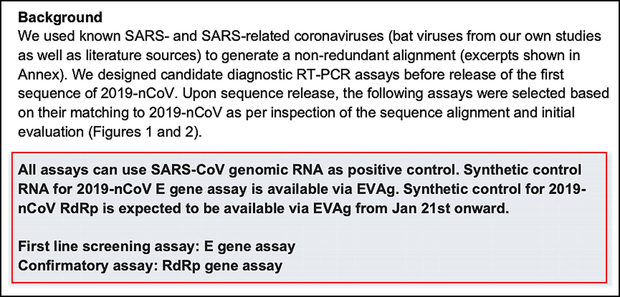 « Η καθιέρωση και επικύρωση μιας διαγνωστικής ροής εργασίας για τον έλεγχο του 2019-nCoV και συγκεκριμένης επιβεβαίωσης, σχεδιάσθηκε ελλείψει διαθέσιμων απομονωμένων ιών ή πρωτότυπων δειγμάτων ασθενών. Ο σχεδιασμός και η επικύρωση κατέστησαν δυνατοί λόγω της στενής γενετικής σχέσης με το SARS-CoV του 2003 και υποβοηθήθηκε από τη χρήση της τεχνολογίας των συνθετικών νουκλεϊκών οξέων. "