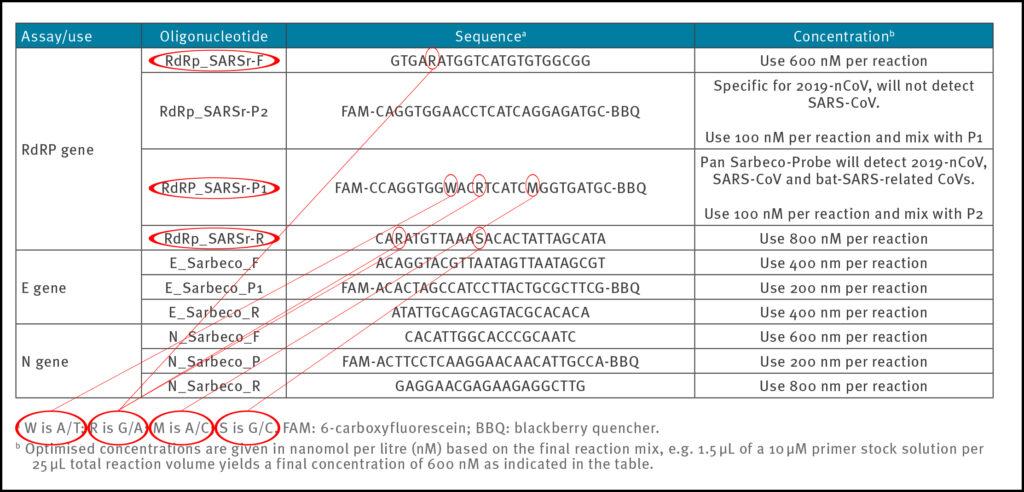 Πίνακας 1: Εκκινητές και ανιχνευτές (βάσει της εργασίας Corman-Drosten. Επισημαίνονται οι εσφαλμένες συγκεντρώσεις εκκινητών)