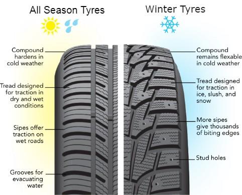 - All-season tyres do not perform as well on snowy roads as winter tyres which can perform in rain, ice and snow. They have larger tread patterns and use softer rubber. This allows a flatter patch and a compact biting edge in the snow. This increases the traction, provides more stability in turns, and improves the stopping power.