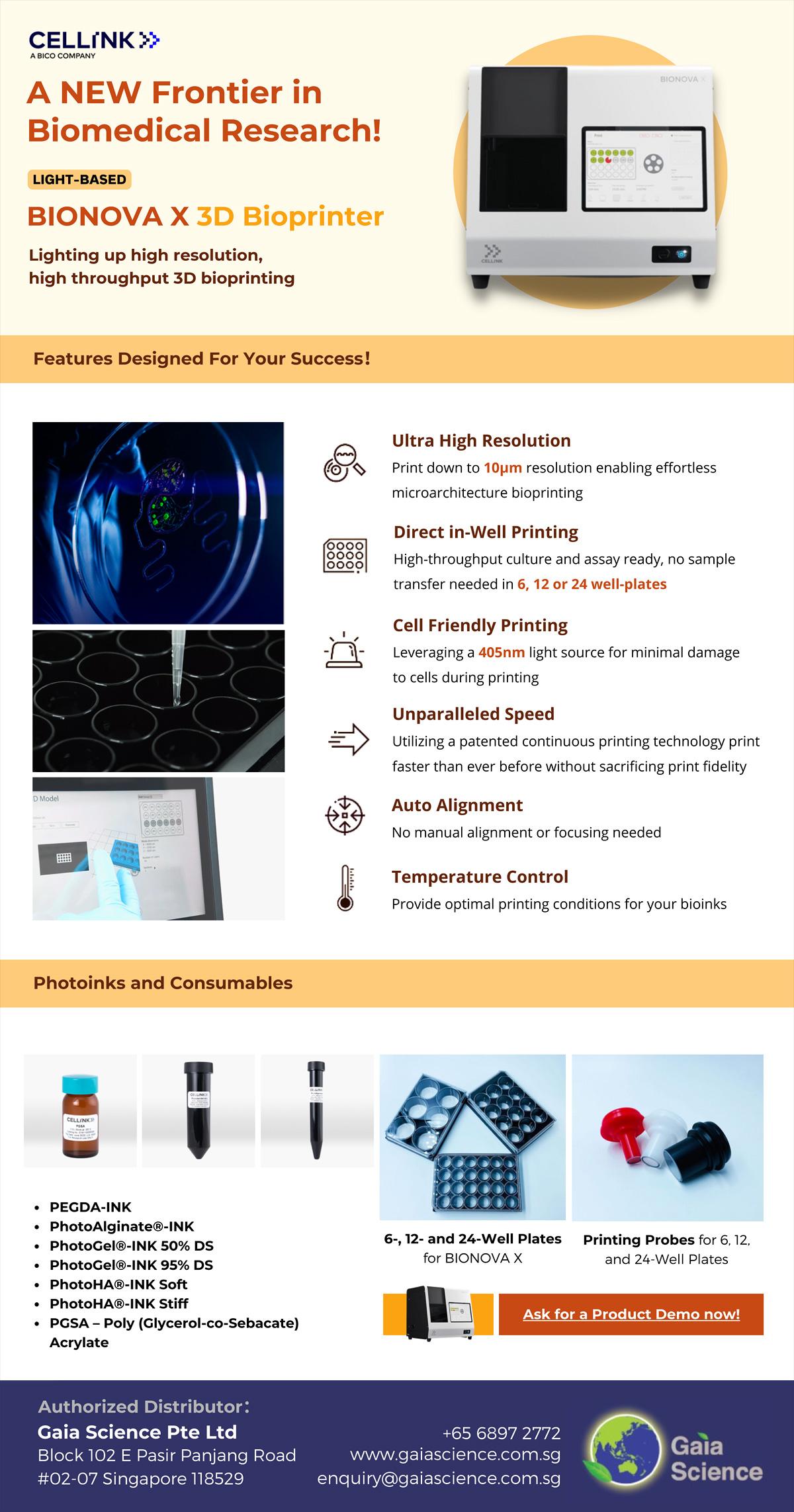 Cellink BIONOVA X 3D Bioprinter Designed with usability in mind, the BIONOVA X enables high resolution live cell printing, a new frontier in light-based 3D bioprinting. With 10?m feature resolution the BIONOVA X is the most accurate DLP 3D bioprinter available. Effortlessly model microarchitecture, vasculature, and complex geometries.