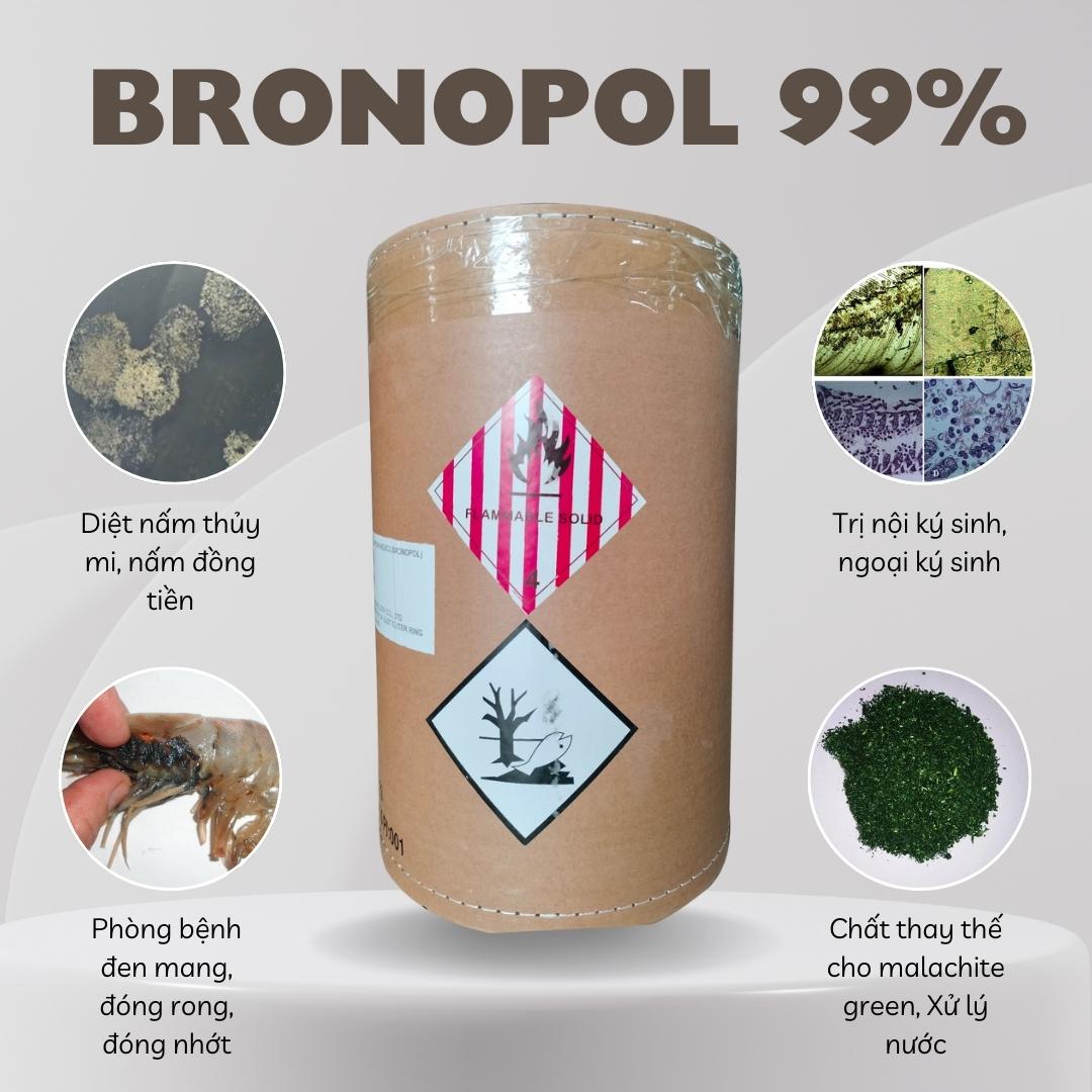 - Bronopol là một chất đặc trị vi nấm nhiễm trên động vật thủy sản, được dùng phổ biến trong trại sản xuất cá giống, ương cũng như nuôi thương phẩm, được xem là chất thay thế cho malachite green.