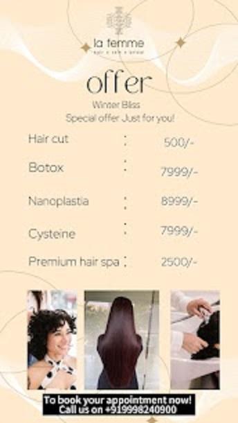 #WinterBlissHairCare #LaFemmeAhmedabad #HairCutOffersAhmedabad #BotoxForHair #Nanoplastia #CysteineTreatment #PremiumHairSpa #SatelliteSalon #AhmedabadHairCare #HairSpecialistsAhmedabad #WinterHairCareDeals