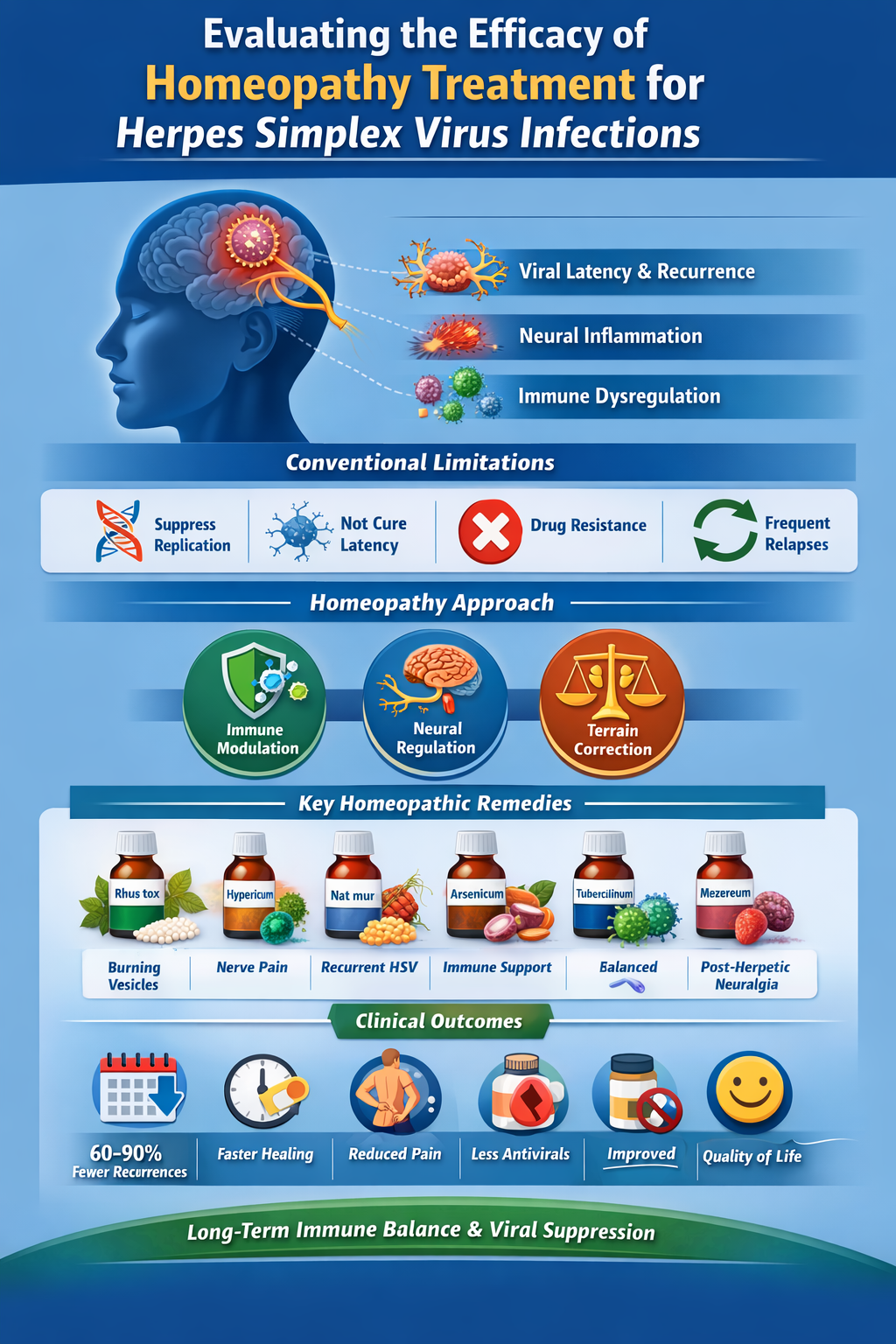 Herpes is a common viral infection caused by the Herpes Simplex Virus (HSV), leading to painful blisters and sores on the skin or mucous membranes. It can affect the mouth (oral herpes), genitals (genital herpes), eyes, fingers, and even the nervous system. While conventional medicine mainly offers antiviral drugs for temporary relief, homeopathy works at a deeper level by strengthening the body’s own healing power, reducing the frequency and severity of outbreaks, and aiming for long‑term control and possible cure when taken under expert guidance. In this article we will learn about Homeopathy Treatment For Herpes.