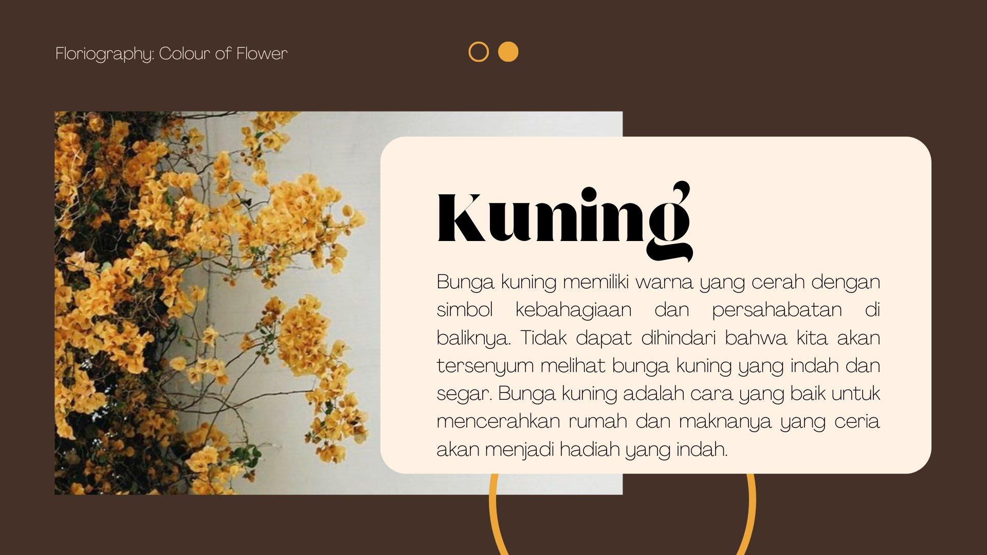 Bunga kuning memiliki warna yang cerah dengan simbol kebahagiaan dan persahabatan di baliknya. Tidak dapat dihindari bahwa kita akan tersenyum melihat bunga kuning yang indah dan segar. Bunga kuning adalah cara yang baik untuk mencerahkan rumah dan maknanya yang ceria akan menjadi hadiah yang indah.