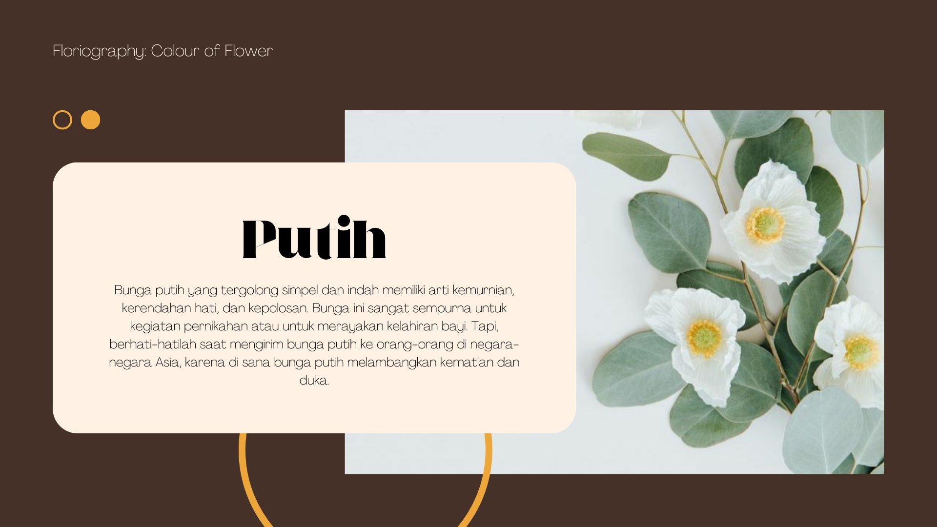 Bunga putih yang tergolong simpel dan indah memiliki arti kemurnian, kerendahan hati, dan kepolosan. Bunga ini sangat sempurna untuk kegiatan pernikahan atau untuk merayakan kelahiran bayi. Tapi, berhati-hatilah saat mengirim bunga putih ke orang-orang di negara- negara Asia, karena di sana bunga putih melambangkan kematian dan duka.