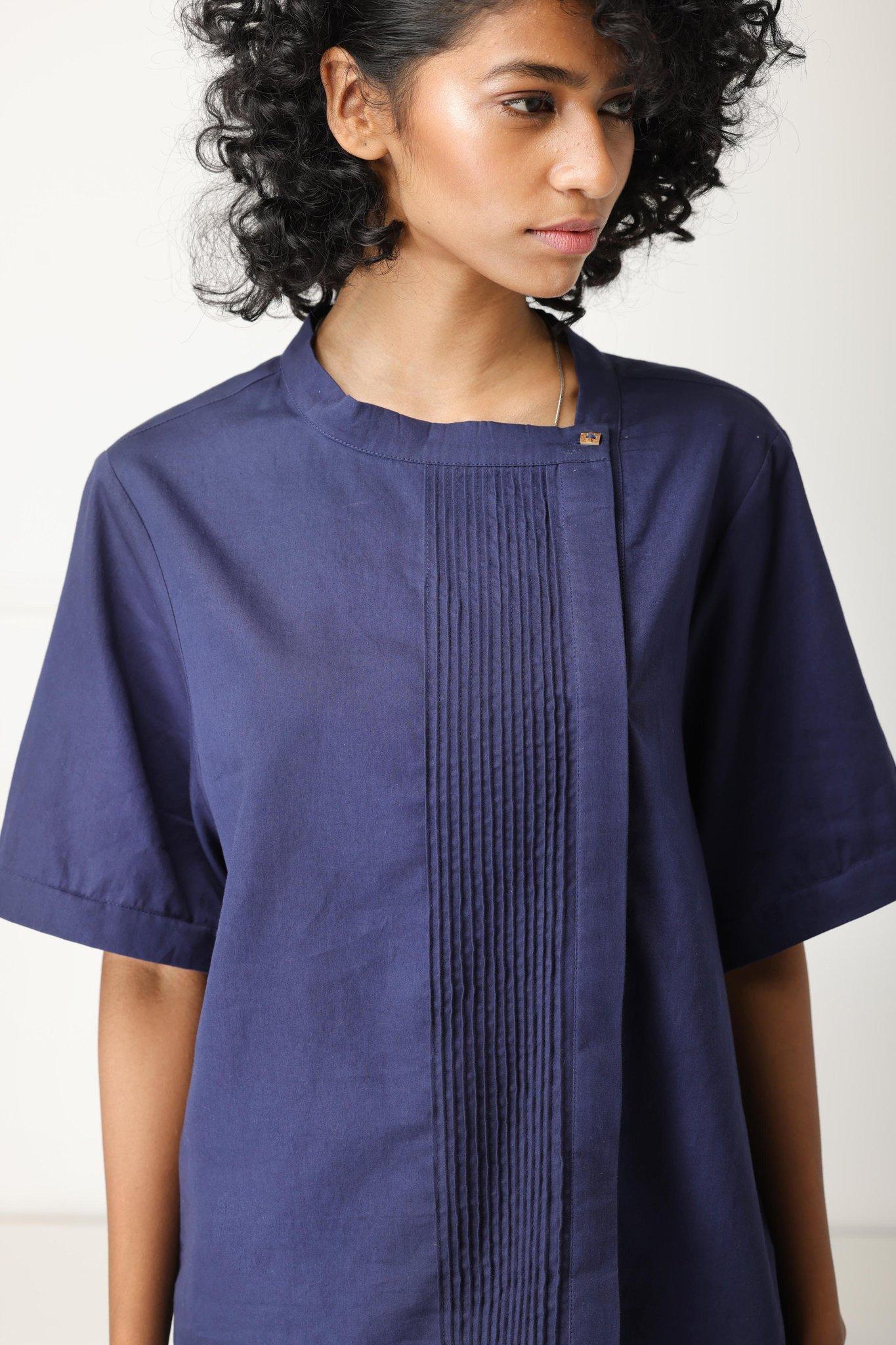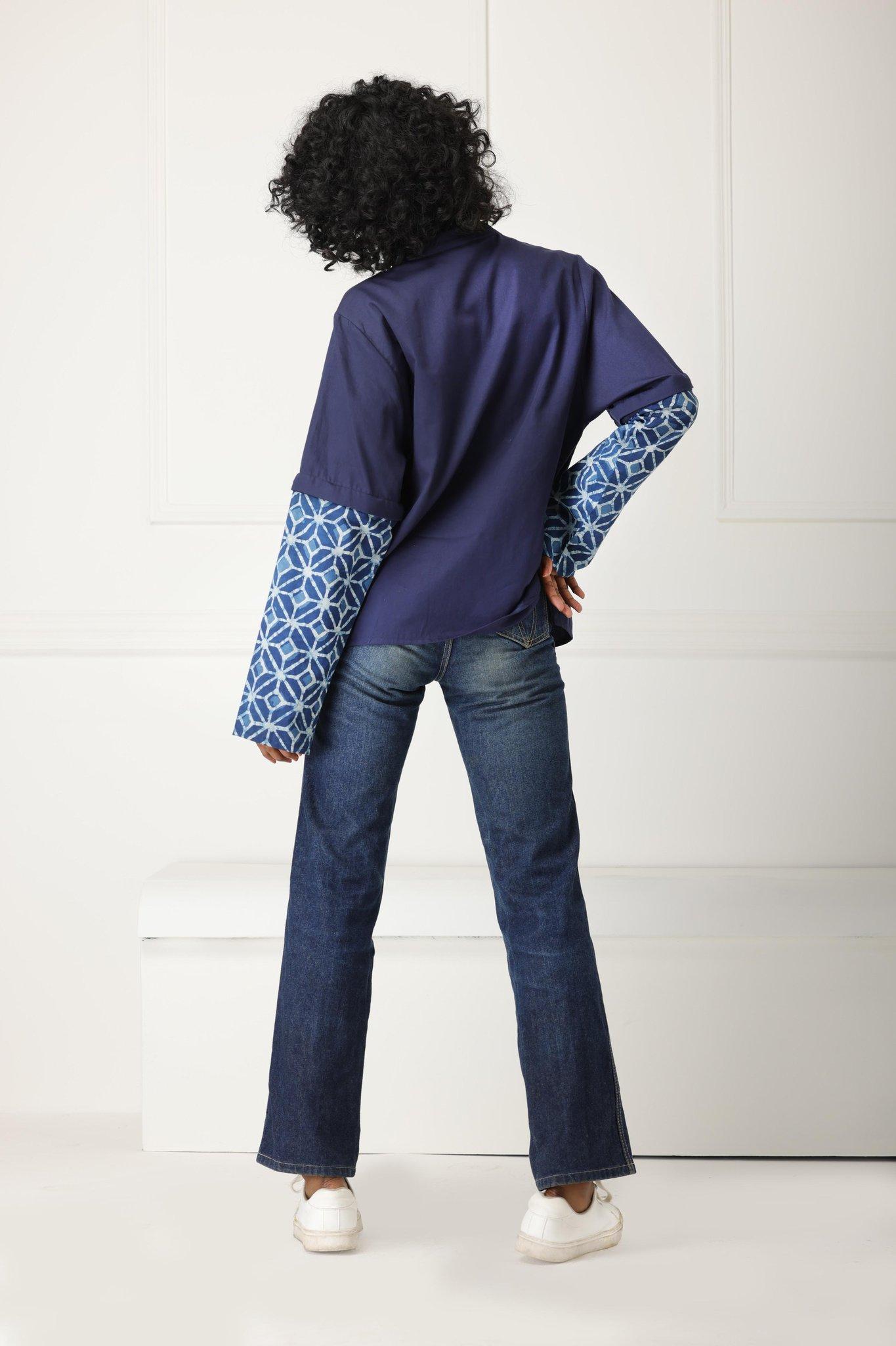 As the moon increases the beauty of a midnight sky, the slant pintucks increases the charm of this midnight blue top. Like the moon the top can transform with two handcrafted block printed sleeves. The top represents different phases of your being, with just changing a sleeve, making it a must have for your wardrobe. This piece is functional yet traditional, it connects different stories while giving you the option to express the story you want.