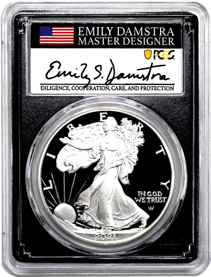 This 2021 W $1 Proof Silver Eagle Type 2 has been certified PR70 DCAM First Day of Issue by PCGS! In addition the label has been hand-signed by the designer of the new Silver Eagle Type 2 Reverse Emily Damstra for PCGS's exclusive Mint Designer Series!