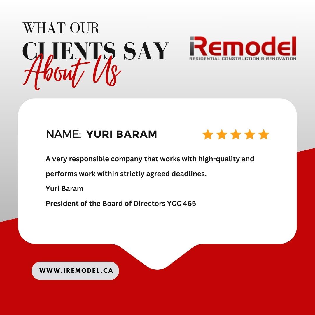 Looking for the Best Home Renovation Company in Toronto? Look no further than iRemodel Home Renovations. We're thrilled to share a fantastic review from one of our satisfied clients, Yuri Baram:
