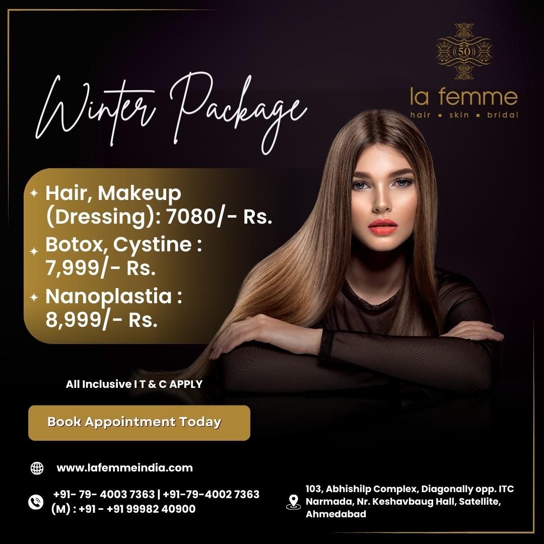 #WinterBeautyPackage #LaFemmeSalon #HairBotox #CystineTreatment #NanoplastiaAhmedabad #MakeupAndDressing #LuxurySalonAhmedabad #VastrapurSalon #AhmedabadBeautyDeals #WinterGlow